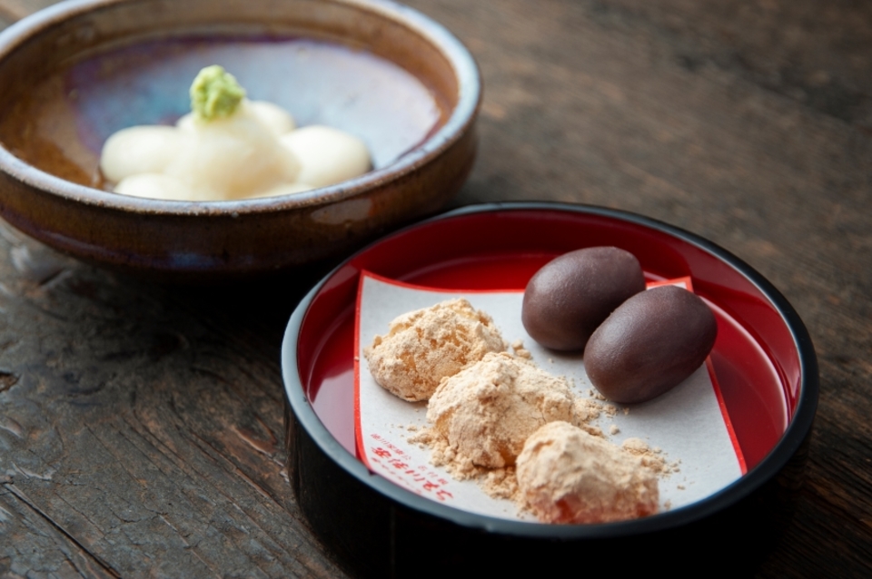 府中宿に古くから伝わる名物で、つきたての餅にきな粉をまぶし、白砂糖をかけたお菓子です。江戸初期に徳川家康公が茶店に立ち寄った際に店主がきな粉を砂金に見立て、安倍川の金な粉餅として献上したといわれています。