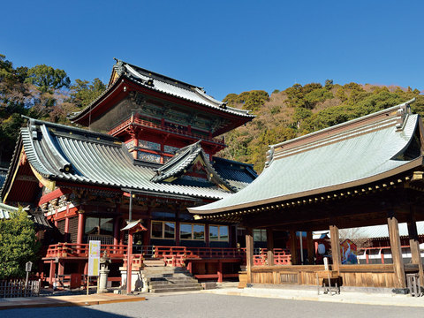 건물 전체에 매우 화려한 옻칠을 한 26동의 호화로운 신전군이 국가 중요문화재로 지정되어 있습니다. '센겐님'이라는 이름으로 에도 시대에는 서민들의 신앙의 대상이기도 했습니다. 매년 4월 5일에 거행되는 20일 축제(廿日会祭: 하쓰카에사이)에서는 어린 아이들이 음악에 맞춰 춤을 추는 치고부가쿠(稚児舞楽, 중요무형민속문화재) 공연이 펼쳐지는데, 이때 아마 다음의 춤(安摩の二の舞, 통칭 즈쟌코)에서 사용되는 탈이 '도카이도 도보 여행기'에 '아사마님의 아마 탈'이라는 이름으로 등장합니다.