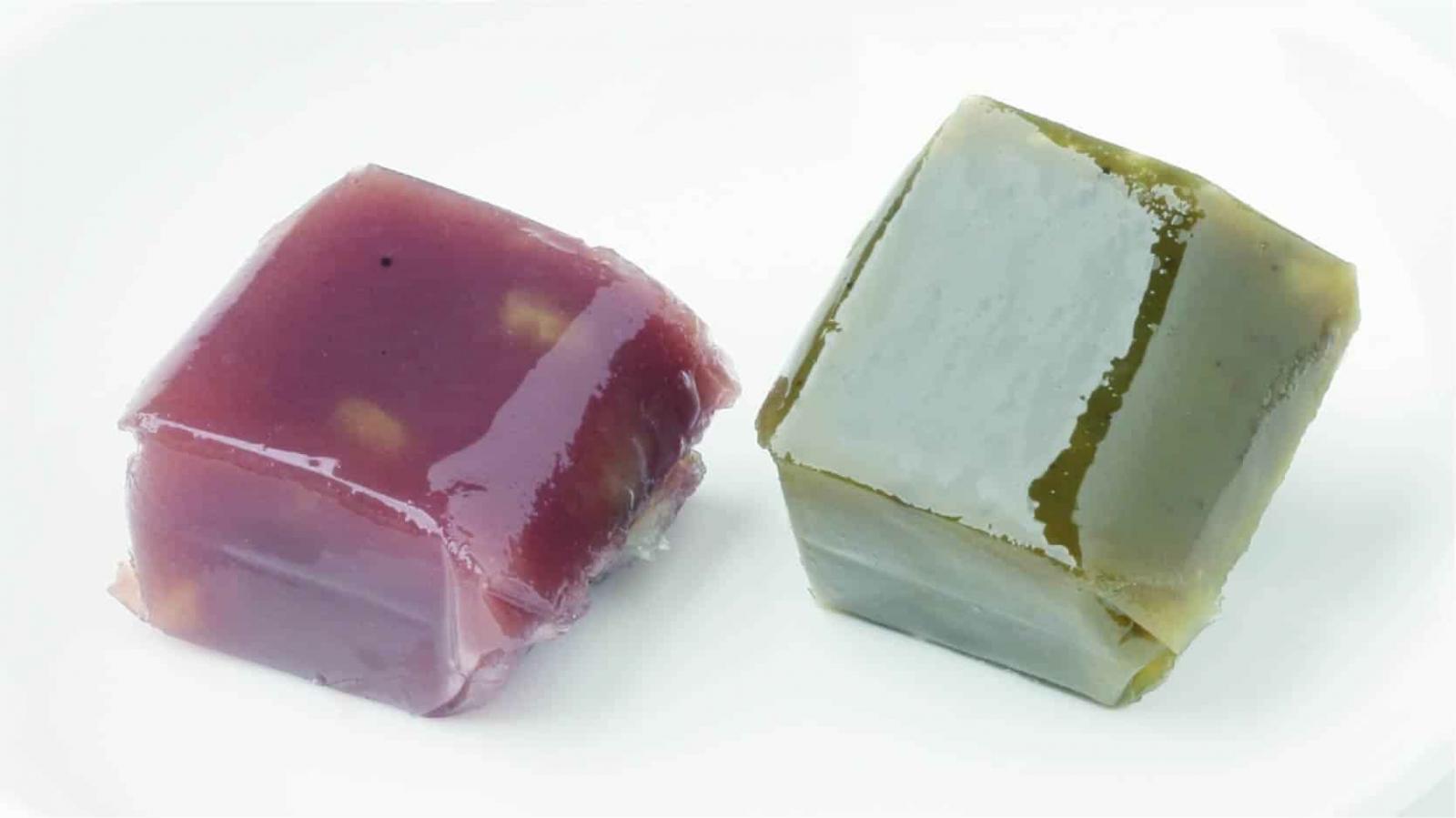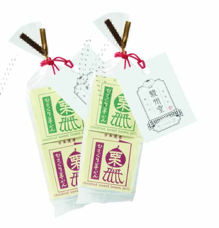 取自彌次先生與喜多先生的「東海道中膝栗毛」之名的栗子羊羹。在白色四季豆中添加靜岡茶葉製成綠色的羊羹,這是表現彌次先生的羊羹,和以紅豆製作茶色,表現喜多先生的羊羹,可以品嚐到2種味道。