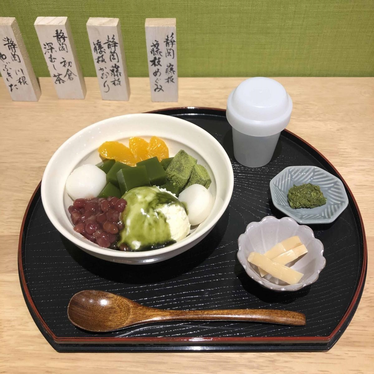 以從江戶時代以來就是有名茶產地的藤枝宿的當地產抹茶,開發了添加豐富抹茶的豆沙水果涼粉。是一樣適合消除旅行疲憊的甜食。