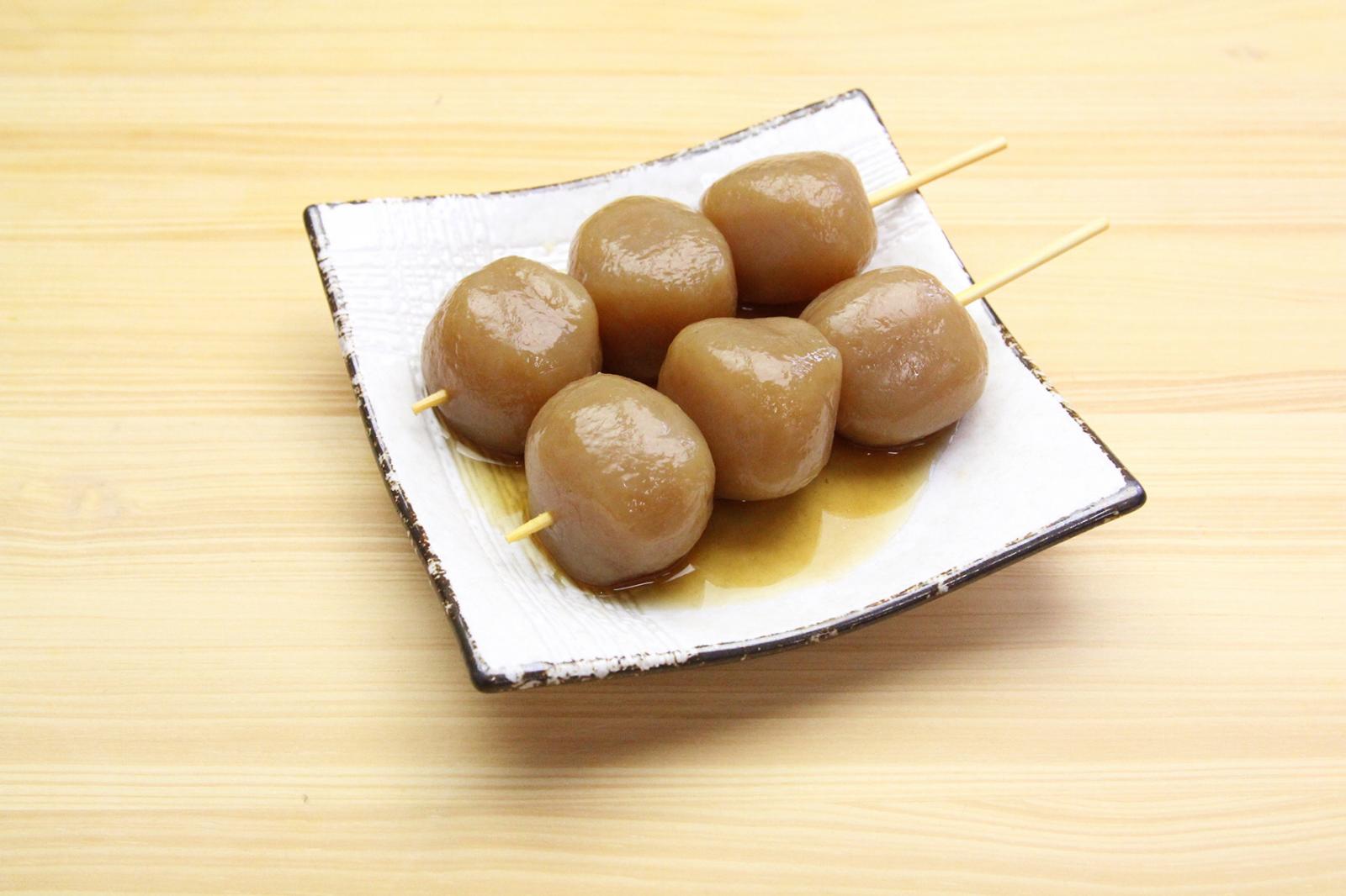 比擬江戶時代人氣的竹串糰子的蒟蒻球串,被做成靜岡名產「靜岡關東煮」。滲入黑色湯汁的Q彈蒟蒻,成為非常受歡迎的靜岡關東煮新選擇。正於靜岡縣內的天神屋(部分店鋪除外)熱銷中。
